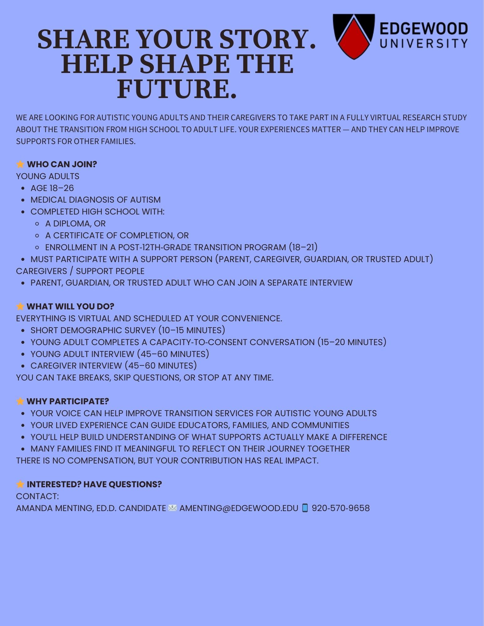 The goal of this research is to elevate autistic voices and better understand what truly supports young adults and their families during the transition to adulthood. Their insights can help shape more responsive, inclusive, and effective services nationwide.