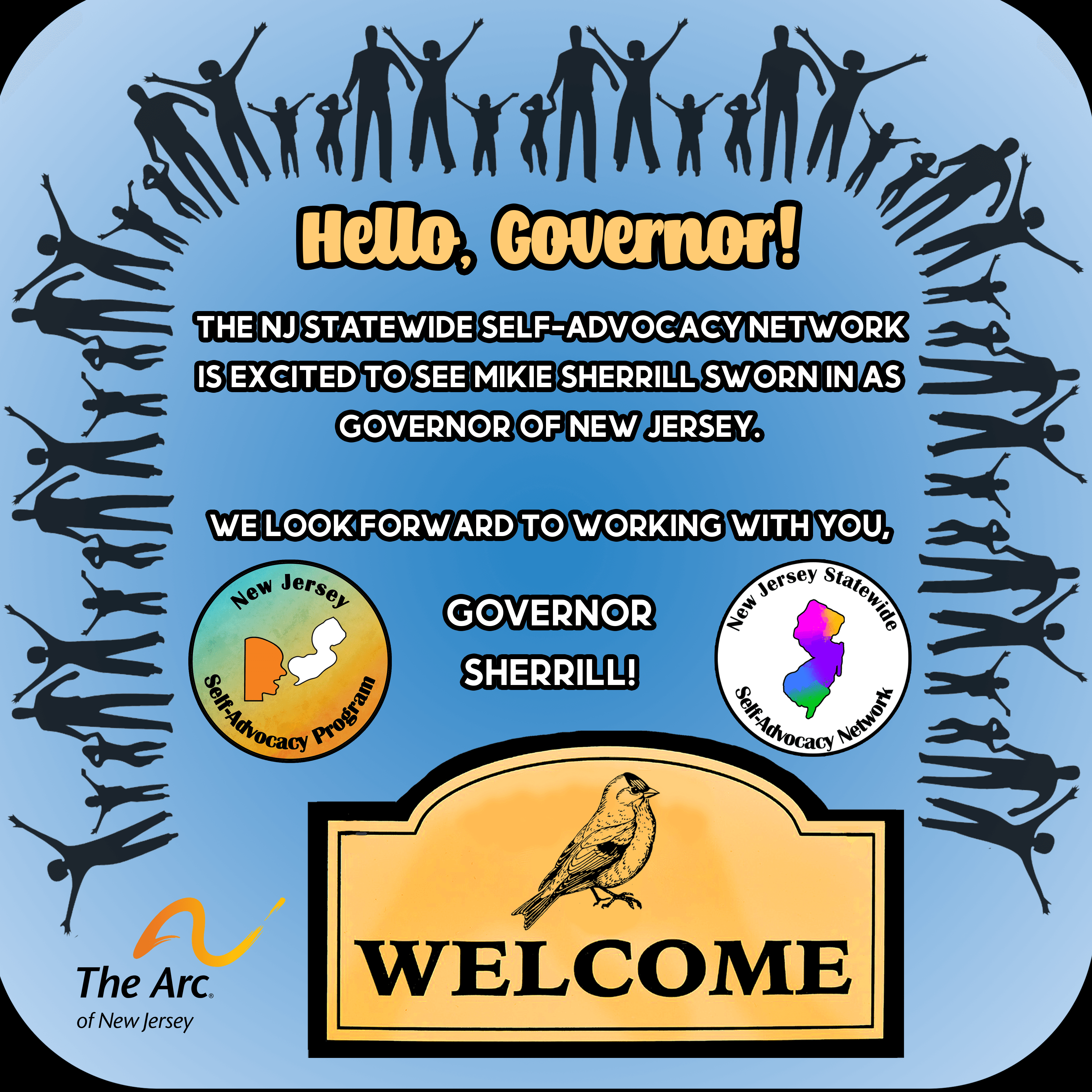 Join our "Hello, Governor" campaign! Mikie Sherrill, the first Democratic woman to win a New Jersey governor's race, was sworn in on Tuesday, January 20th as the state's 57th Governor. The goal of this campaign is to welcome her into her chief executive position and to formally introduce the local chapters of The Arc of NJ, as well as advocates in the NJ Statewide Network. As the new Governor begins her term, we want to share our enthusiasm for working together in the future. We believe that meaningful collaboration between state leadership and self-advocates is essential to creating policies that are inclusive, effective, and equitable. We look forward to opportunities to engage with this administration and to help ensure that the needs, experiences, and perspectives of people with disabilities remain involved in the decisions being made at every level of government.