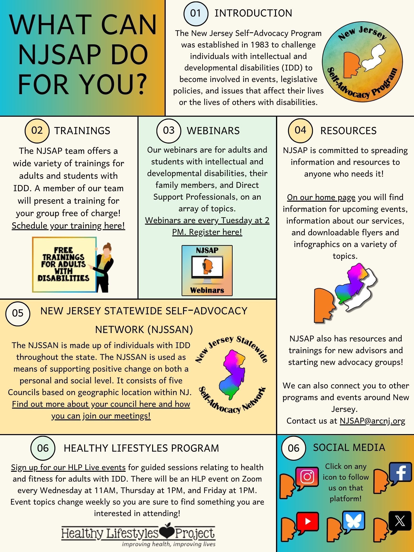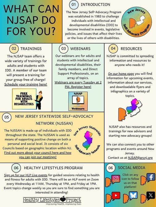 The New Jersey Self-Advocacy Program (NJSAP) was established in 1983 to challenge individuals with intellectual and developmental disabilities to become involved in events, legislative policies, and issues that affect their lives or lives of others with disabilities.